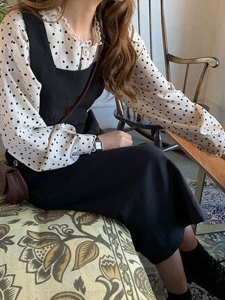 ワンピース ブラウス Aラインワンピース ひざ下 ミモレ丈 長袖 水玉 春 夏 秋 フレア セミフレア Aライン ウエストマーク かわいい 大人可愛い きれいめ シンプル カジュアル 大人 上品 おしゃれ お洒落 大人可愛い 大人女子 ハイネック ミモレ 袖あり パフスリーブ ワンピドレス 2点セット 白 ホワイト 黒 ブラック モノトーン S M L XL 10代 20代 30代 40代 50代 60代 学生 デート お出かけ 女子会 お泊まり 休日 着回し 普段使い 重ね着 | Rena 韓国ファッション レディースアパレル