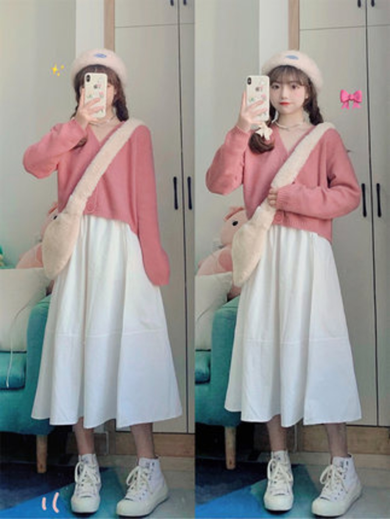 女の子らしさ満点、ピンクのセーターとホワイトのスカートのセットです。