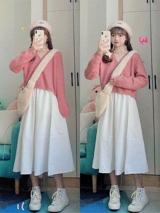 セットアップ セーター Aラインワンピース ロング丈 長袖 無地 春 秋 冬 フレア かわいい 大人可愛い シンプル 大人 おしゃれ ラフ キュート ガーリー Vネック ロング 袖あり 2点セット 白 ホワイト ピンク S M L XL 10代 20代 30代 40代 50代 60代 学生 通学 デート お出かけ 公園デビュー 女子会 お泊まり 休日 普段使い 重ね着 | Rena 韓国ファッション レディースアパレル