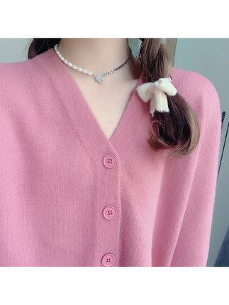 セーターはフロントボタンで可愛らしく、暖かさもバッチリ。