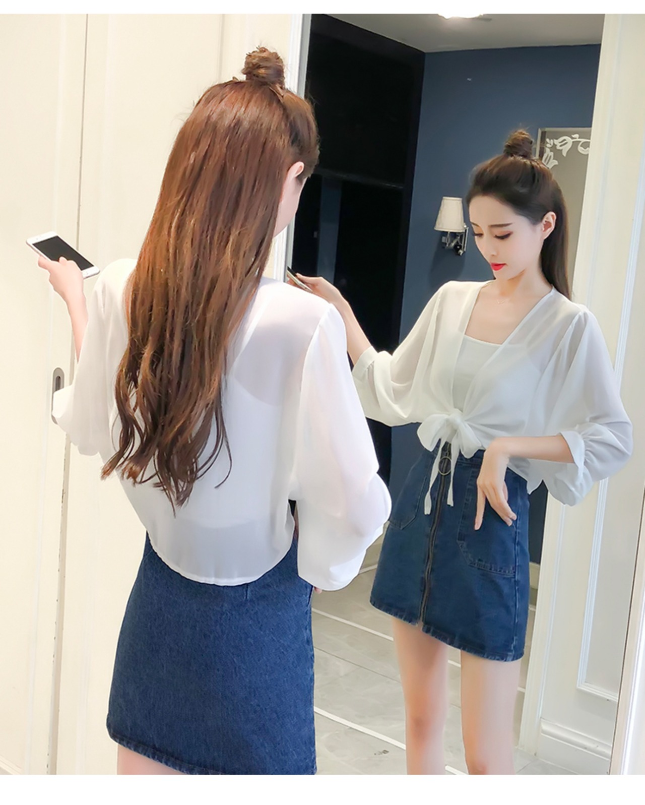 ブラウス キャミソール 七分袖 無地 春 夏 ウエストリボン 前開き 透け感 シースルー かわいい 大人可愛い シンプル カジュアル おしゃれ お洒落 こなれ感 ラフ ラブリー キュート ガーリー ルーズ 個性的 パフスリーブ 2点セット ホワイト ブラック S M L XL 10代 20代 30代 女性用 学生 デート お出かけ 女子会 休日 リゾート 旅行 海 着回し 普段使い 韓国 韓国系 ファッション コーデ スタイル モテ | Rena 韓国ファッション レディースアパレル