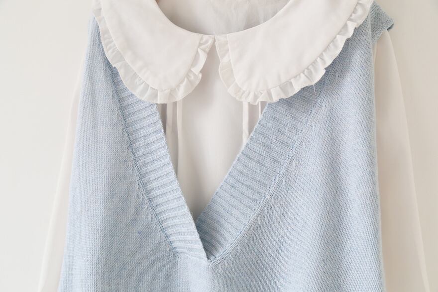 今季流行りのニットベストとガーリーなシャツが一緒になった商品です。