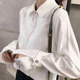 オフィスカジュアルや街コーデにオススメのシルクサテンシャツです。