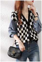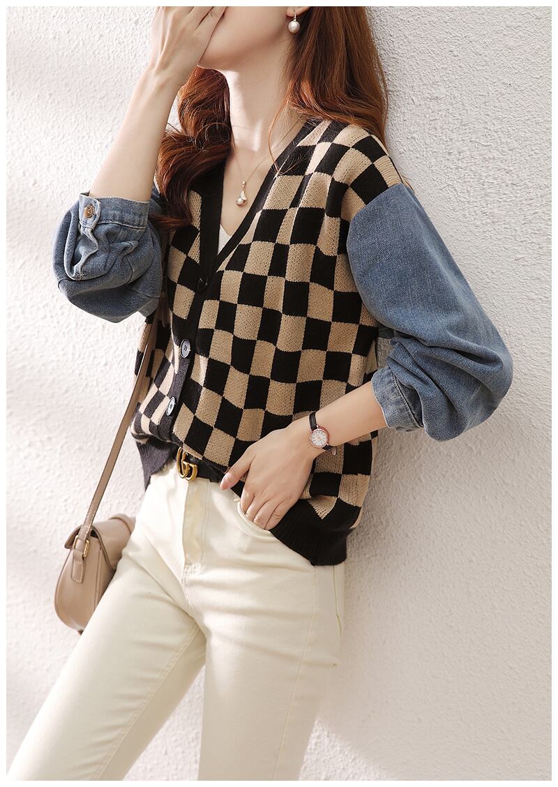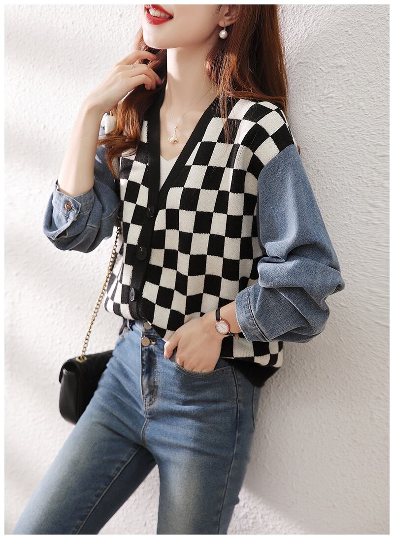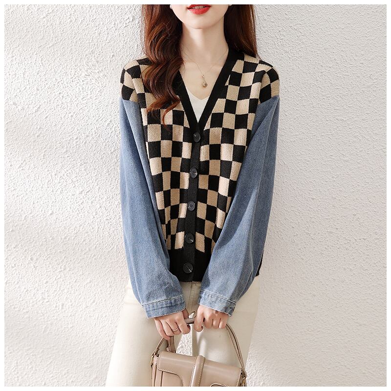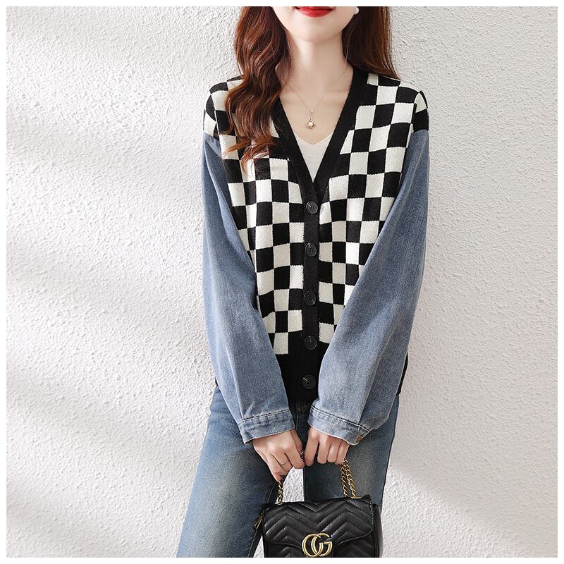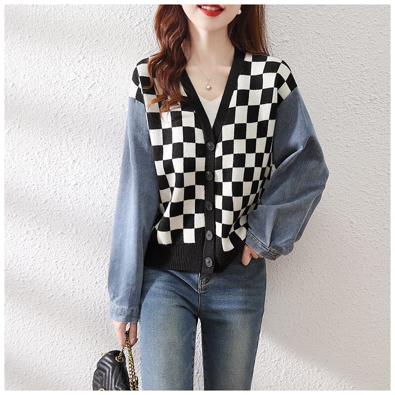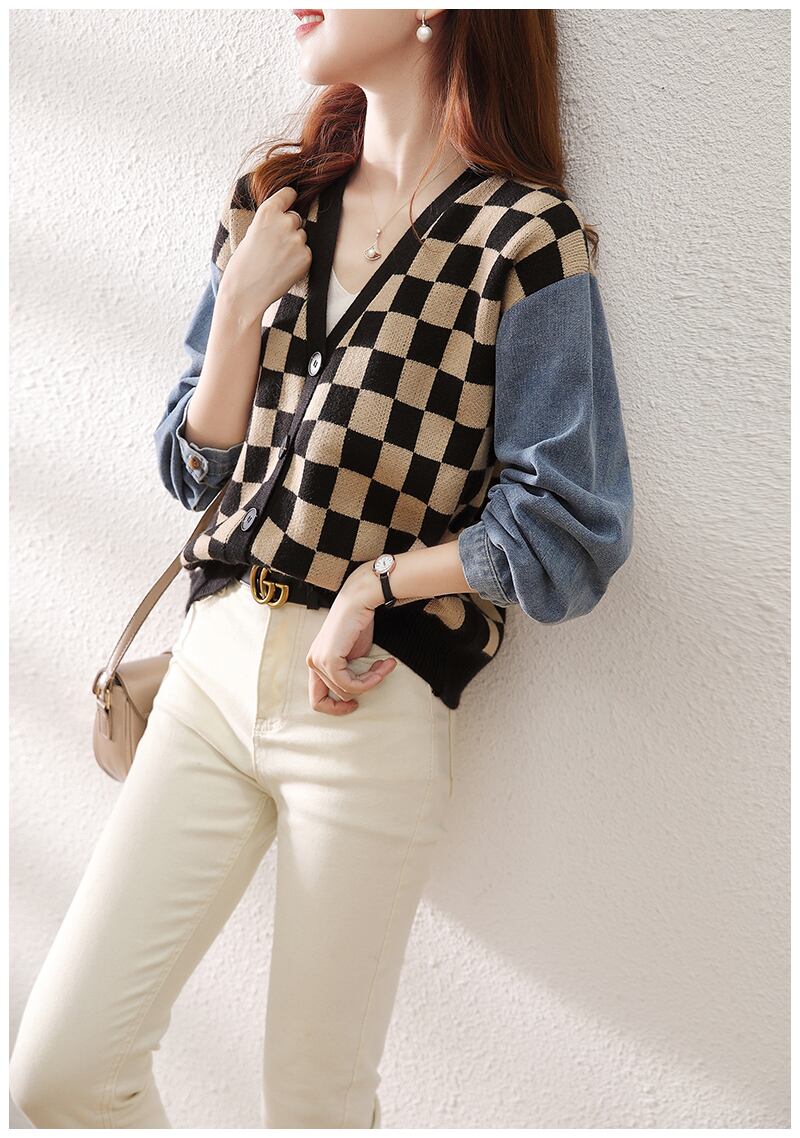 格子柄とデニムの生地が合わさった、フェイクツーピースのカーディガンです。