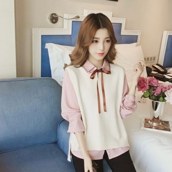 シャツ ベスト 長袖 無地 秋 冬 リボン 前開き かわいい 大人可愛い カジュアル 大人 上品 おしゃれ お洒落 レトロ 大人女子 こなれ感 ラブリー キュート ガーリー 主役級 襟付き 袖あり 2点セット お得 青 ブルー ピンク S M L XL 2XL 3XL 10代 20代 通勤 学生 通学 デート お出かけ 女子会 パーティー イベント 旅行 着回し 普段使い 重ね着 お揃い 双子 韓国 韓国系 ファッション コーデ スタイル モテ インスタ映え | Rena 韓国ファッション レディースアパレル