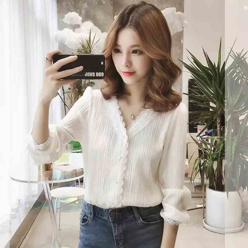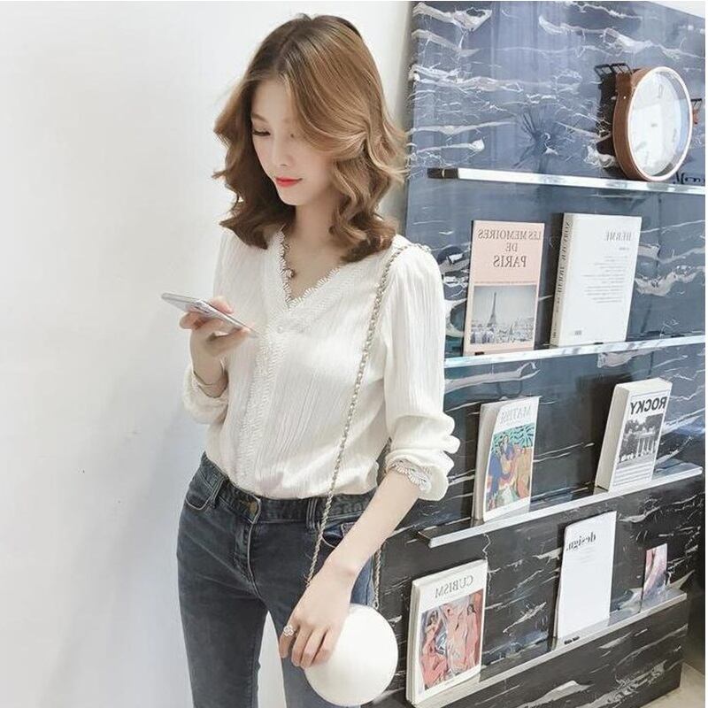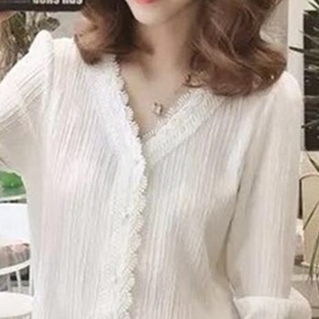 ブラウス 長袖 無地 春 秋 レース 前開き 大人可愛い きれいめ シンプル 大人 上品 おしゃれ お洒落 かっこいい 大人女子 クール セクシー エレガント Vネック 白シャツ S M L XL 2XL 3XL 4XL 10代 20代 30代 40代 オフィス ビジネス OL デート お出かけ 女子会 パーティー イベント 普段使い 楽ちん | Rena 韓国ファッション レディースアパレル