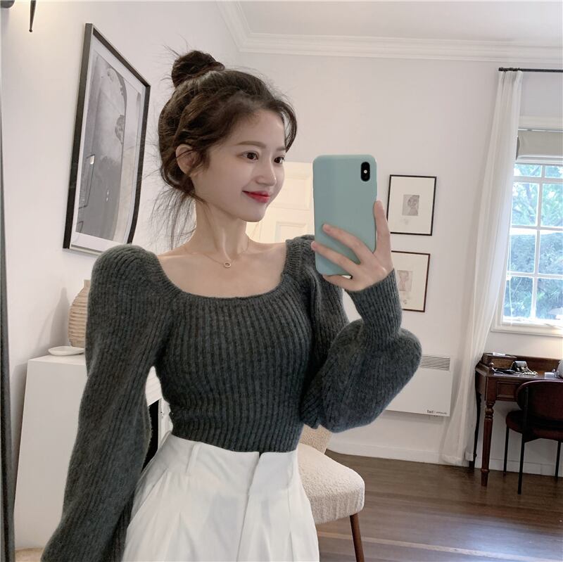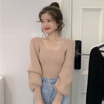 大胆に空いた胸元とパフスリーブのコントラストが可愛いニットです。