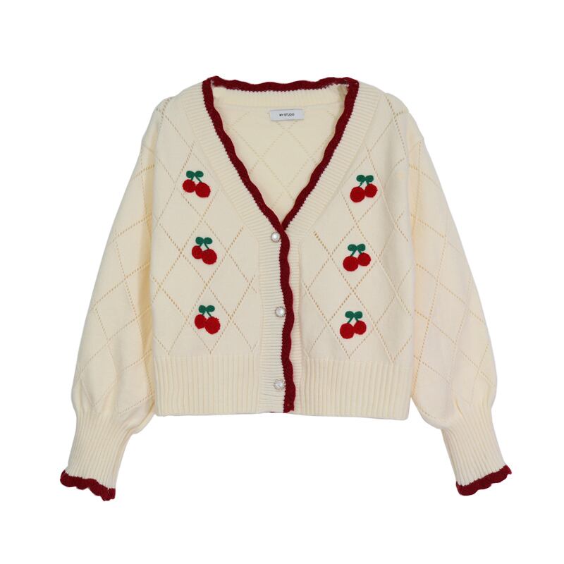 アウター レディース ニット カーディガン 長袖 柄 チェリー 春 秋 かわいい 大人可愛い シンプル カジュアル 大人可愛い ラブリー キュート ガーリー 個性的 Vネック 萌袖 白 ホワイト 黒 ブラック 通勤 通学 お出かけ 公園デビュー 女子会 ファッション コーデ あったか インスタ映え | Rena 韓国ファッション レディースアパレル