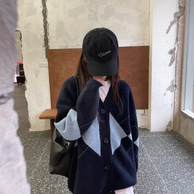 アウター レディース ニット セーター カーディガン アーガイルチェック 秋 冬 かわいい カジュアル 大人 おしゃれ かっこいい 大人可愛い こなれ感 ラフ ガーリー ルーズ Vネック 紺 ゆったり オフィス 通勤 学生 通学 お出かけ 公園デビュー 楽ちん あったか 防寒