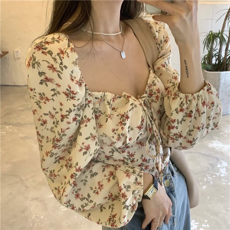 ブラウス カットソー 長袖 小花柄 春 秋 スクエアネック パフスリーブ 10代 20代 30代 通学 デート お出かけ 女子会 お泊まり コーデ インスタ映え | Rena 韓国ファッション レディースアパレル