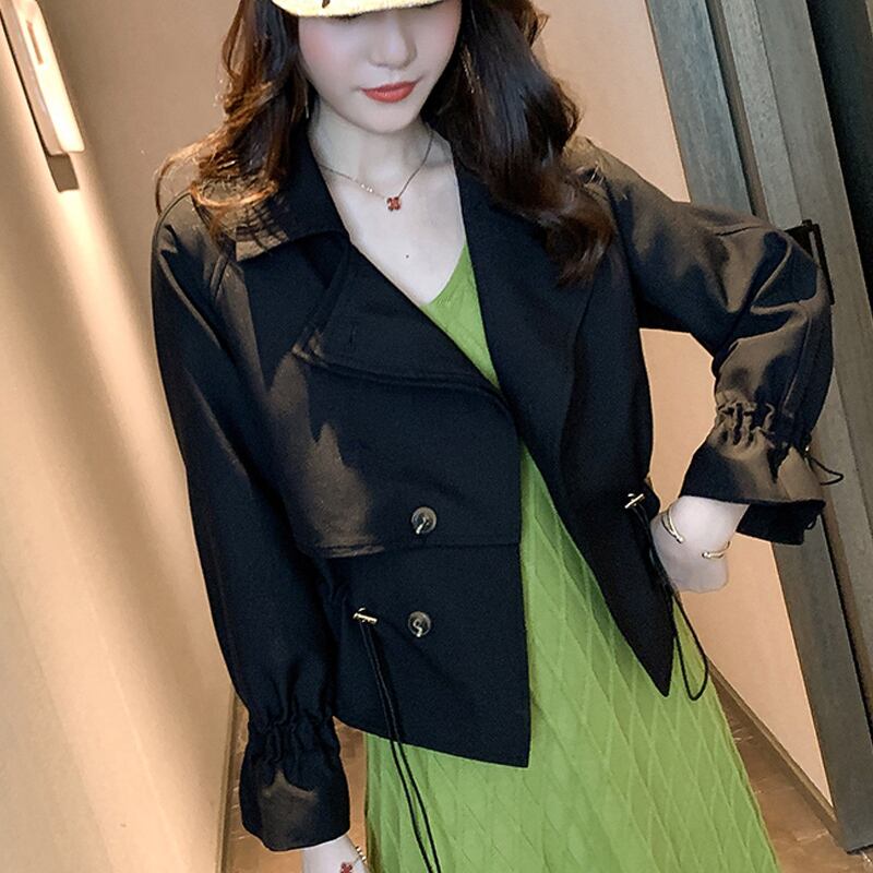 袖とウエスト部分に調節可能な紐が付いたライダースジャケットです。
