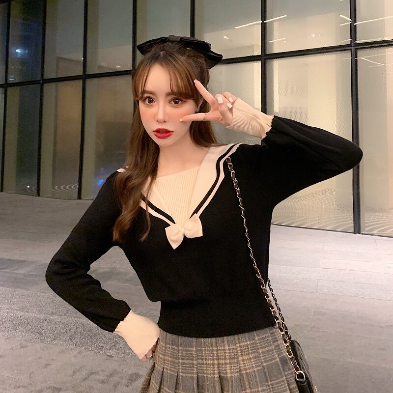ニット セーター 長袖 無地 秋 冬 スリム タイト 細身 リボン かわいい カジュアル おしゃれ お洒落 ラブリー キュート ガーリー スクエアネック 襟付き ニット ブラック XL 2XL 3XL 4XL 10代 20代 女性用 学生 デート お出かけ 女子会 休日 普段使い オルチャン ファッション コーデ スタイル あったか 暖かい