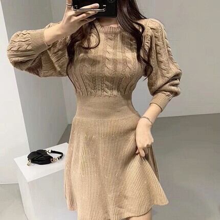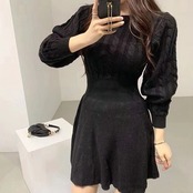 ワンピース ニット ミニ丈 長袖 無地 秋 冬 Aライン ウエストマーク かわいい おしゃれ お洒落 キュート ガーリー Uネック ミニ 袖あり パフスリーブ ニット 黒 ブラック ベージュ S M L XL 大きいサイズ 10代 20代 女性用 学生 通学 デート お出かけ 女子会 お泊まり 休日 イベント クリスマス ファッション スタイル あったか 暖かい 防寒 モテ 美脚 脚長 プチプラ 送料無料 | Rena 韓国ファッション レディースアパレル