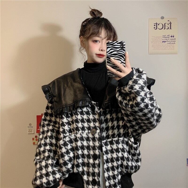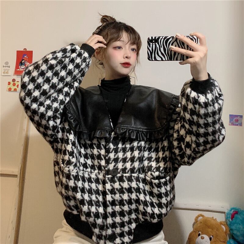 アウター レディース ブルゾン ジャケット 長袖 千鳥格子 秋 冬 かわいい 大人可愛い 大人女子 キュート ガーリー 襟付き 黒 ブラック 茶色 ブラウン 大きいサイズ フリーサイズ ゆったり ゆる 10代 20代 女性用 学生 通学 デート お出かけ 公園デビュー 女子会 休日 着回し 普段使い ファッション コーデ あったか 暖かい 防寒 プチプラ 送料無料 | Rena 韓国ファッション レディースアパレル