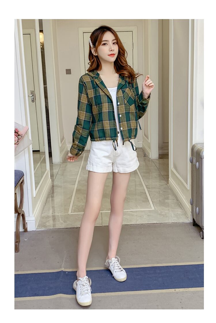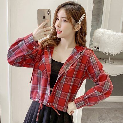 シャツ ブラウス 長袖 チェック 秋 冬 フード付き 前開き かわいい カジュアル おしゃれ ラフ ボーイッシュ フーディー 黒 ブラック 赤 レッド 緑 グリーン S M L XL 大きいサイズ 10代 20代 30代 女性用 学生 通学 デート お出かけ 公園デビュー 女子会 休日 着回し 普段使い ファッション コーデ プチプラ 送料無料 | Rena 韓国ファッション レディースアパレル
