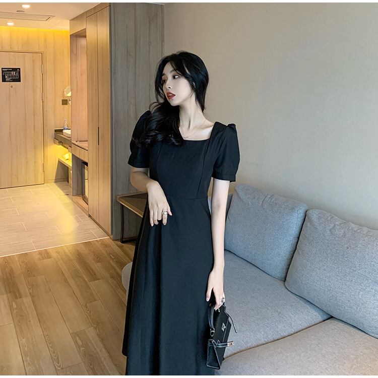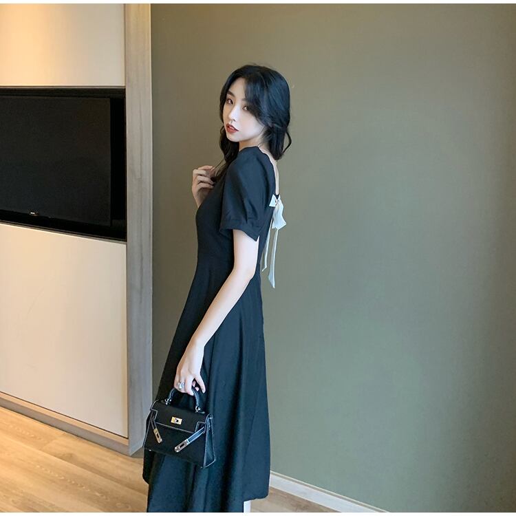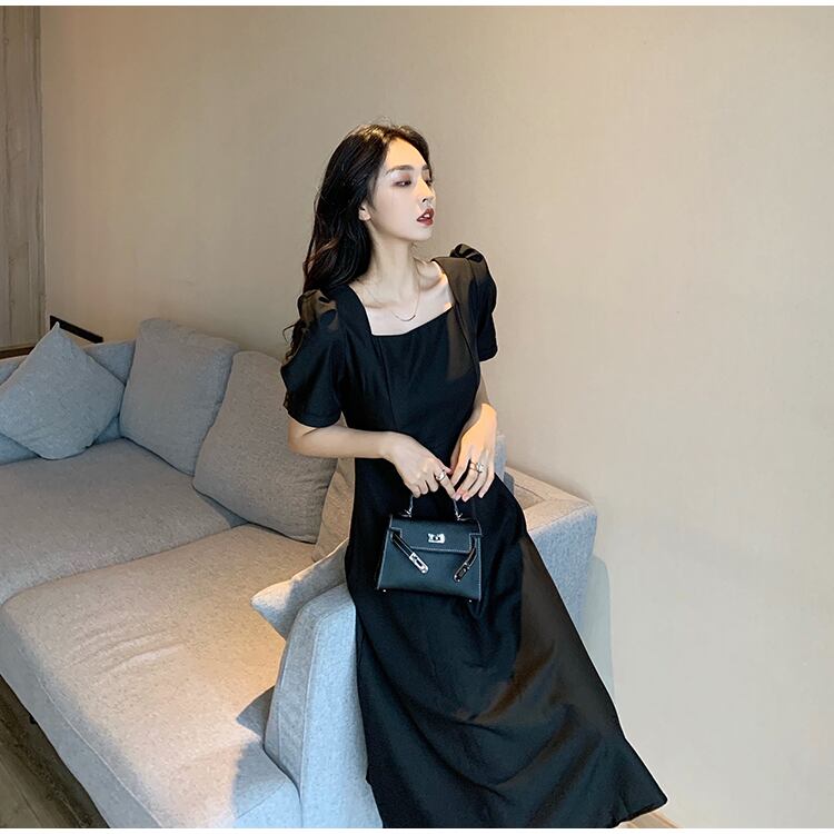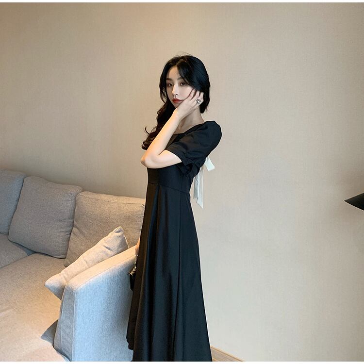 ワンピース ミモレ丈 半袖 無地 春 夏 秋 リボン かわいい 大人可愛い きれいめ 上品 おしゃれ 大人女子 ガーリー スクエアネック パフスリーブ 黒 ブラック S M L XL 大きいサイズ 10代 20代 30代 女性用 学生 通学 デート 女子会 お泊まり 休日 旅行 着回し 普段使い ファッション コーデ スタイル モテ プチプラ 送料無料 | Rena 韓国ファッション レディースアパレル