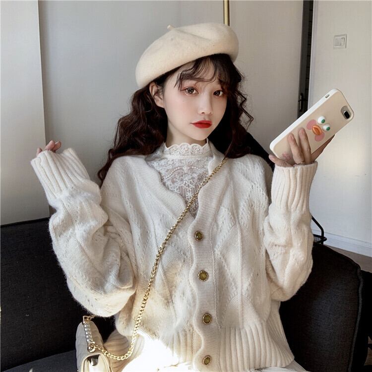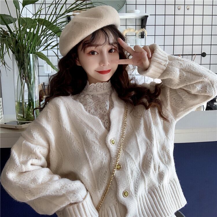 かわいいレースのトップスと、暖かさバッチリのカーディガンのセットです。