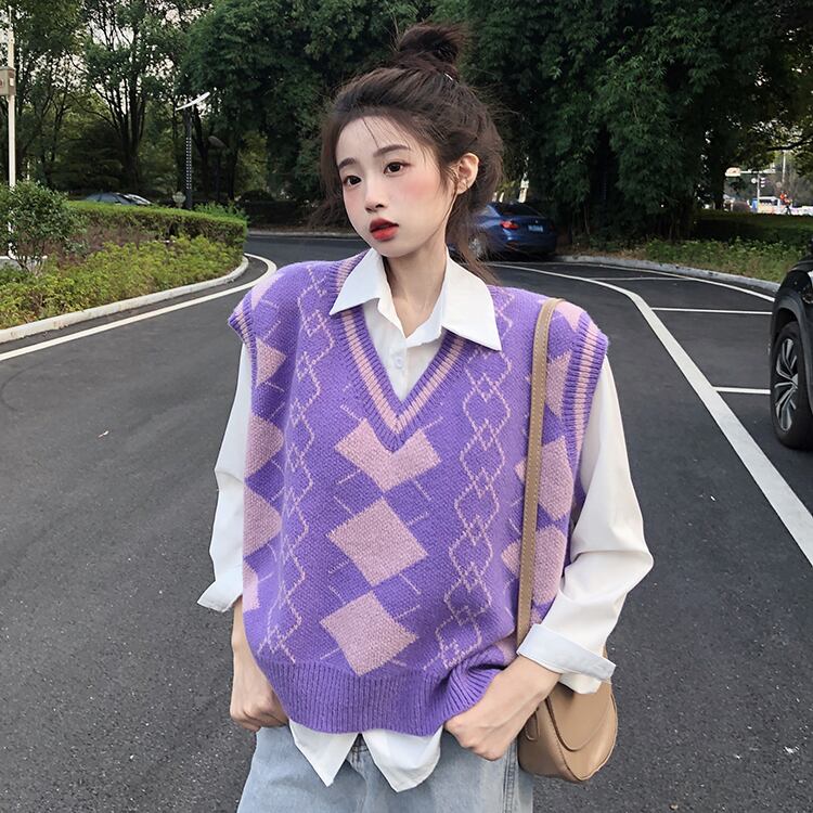 ニット ベスト 柄 秋 冬 かわいい 大人可愛い カジュアル おしゃれ マニッシュ スポーティー ラブリー キュート ガーリー Vネック 襟なし 袖なし 紫 パープル ピンク 水色 大きいサイズ フリーサイズ ビッグサイズ ゆったり ゆる 10代 20代 学生 通学 デート お出かけ 着回し 普段使い 重ね着 韓国系 オルチャン ファッション コーデ スタイル あったか プチプラ 送料無料 | Rena 韓国ファッション レディースアパレル