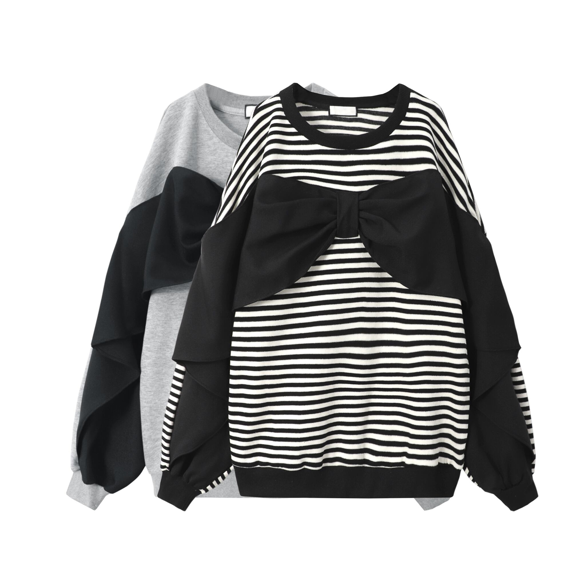 カットソー セーター 長袖 無地 ボーダー 春 秋 冬 リボン かわいい 大人可愛い きれいめ シンプル カジュアル 大人 上品 おしゃれ 大人女子 こなれ感 クルーネック 綿 グレー フリーサイズ ゆったり ゆる 10代 20代 30代 40代 学生 通学 お出かけ 公園デビュー 女子会 お泊まり 休日 普段使い 楽ちん プチプラ 送料無料 | Rena 韓国ファッション レディースアパレル