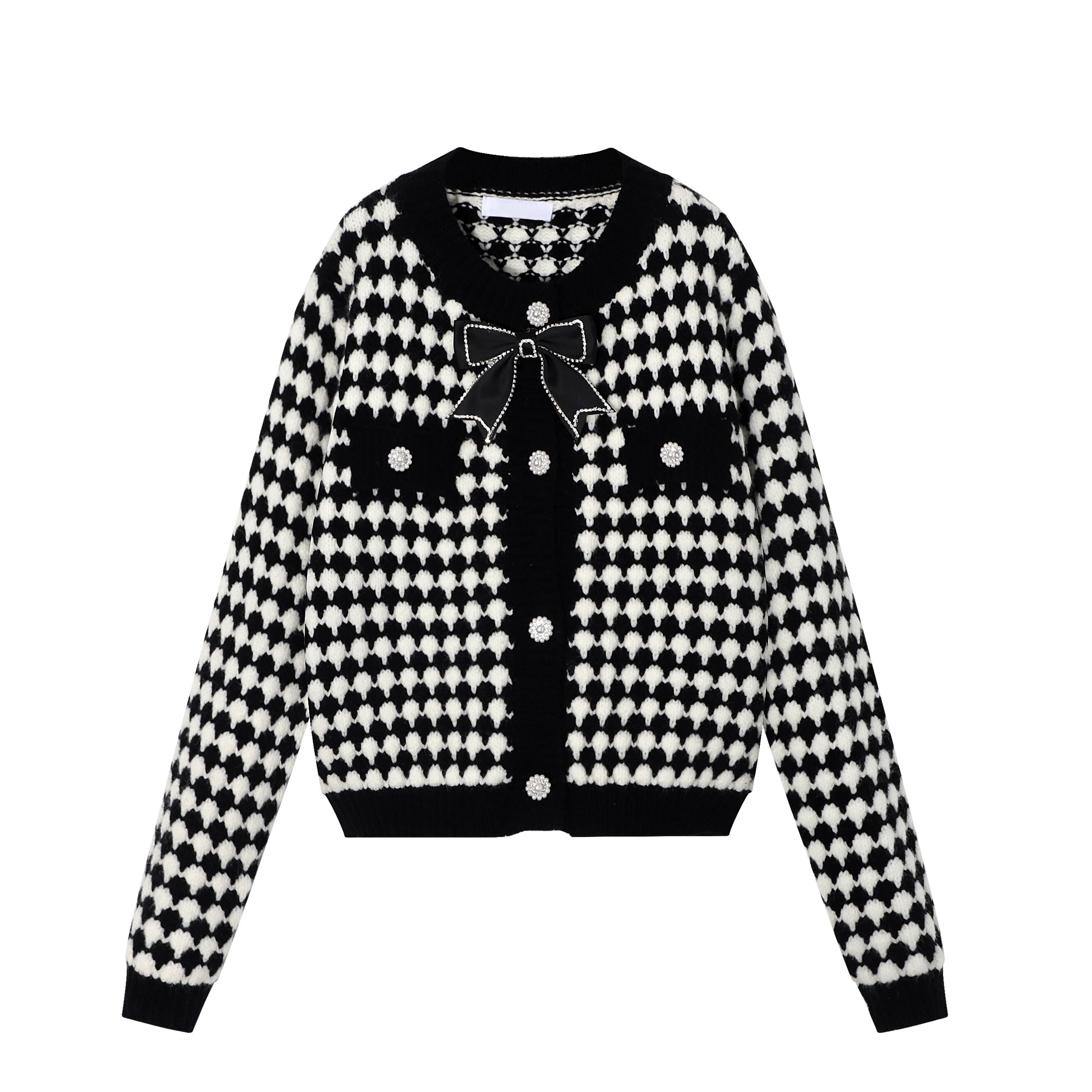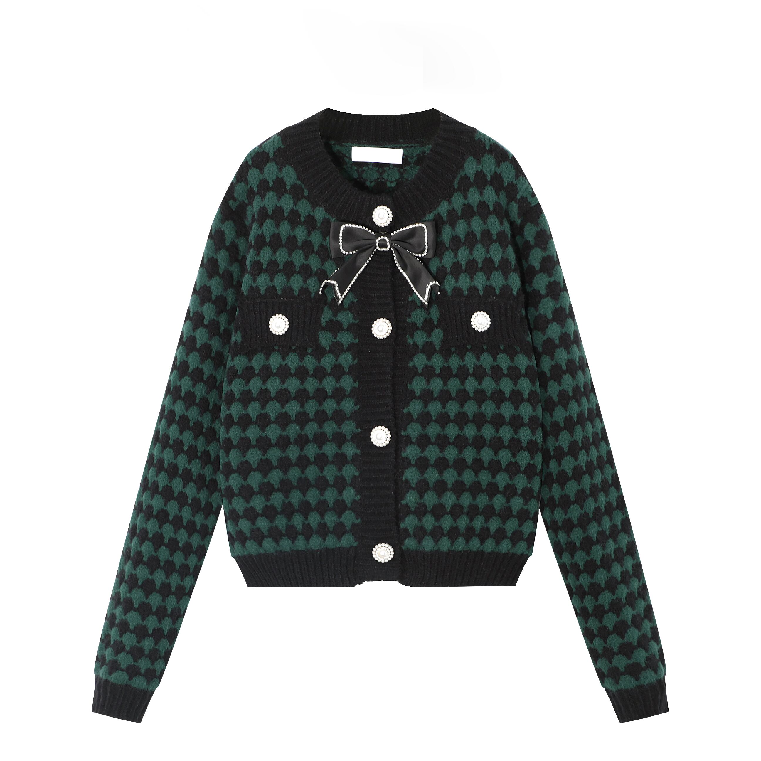 アウター レディース ニット カーディガン 長袖 格子柄 ボタン 冬 リボン かわいい カジュアル 大人 おしゃれ かっこいい レトロ ガーリー 個性的 Uネック 白 ホワイト 黒 ブラック 緑 グリーン 通勤 デート お出かけ 公園デビュー 女子会 お泊まり 重ね着 あったか 暖かい モテ | Rena 韓国ファッション レディースアパレル