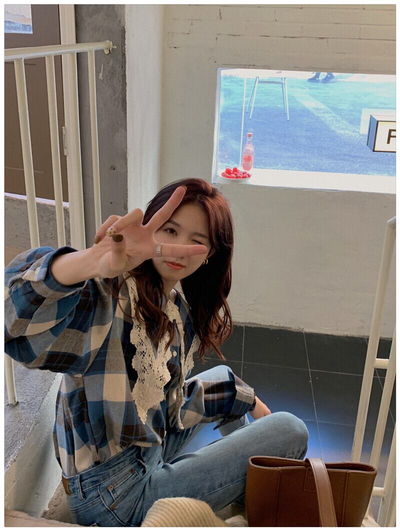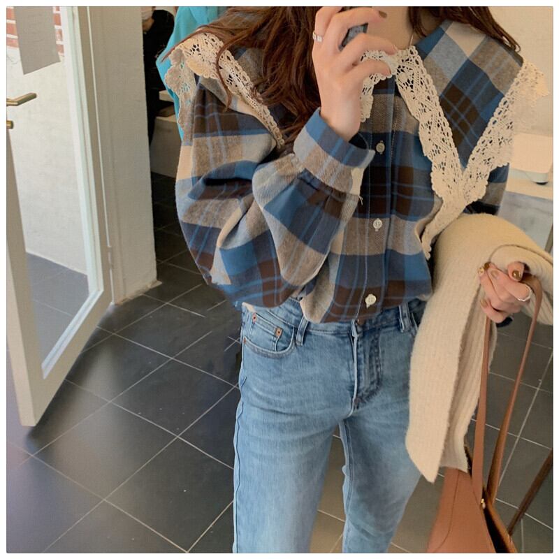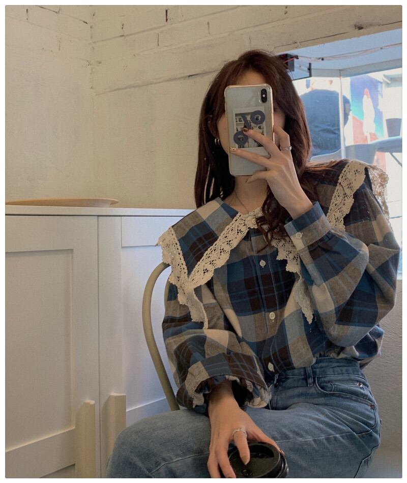 シャツ ブラウス 長袖 柄 チェック 格子柄 ギンガムチェック フリル かわいい 大人可愛い カジュアル おしゃれ かっこいい レトロ 大人可愛い キュート ガーリー Uネック 襟付き 青 ブルー S M L XL 2XL デート お出かけ 公園デビュー 女子会 お泊まり イベント リゾート 旅行 コーデ モテ | Rena 韓国ファッション レディースアパレル