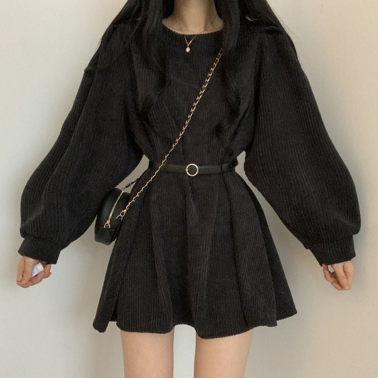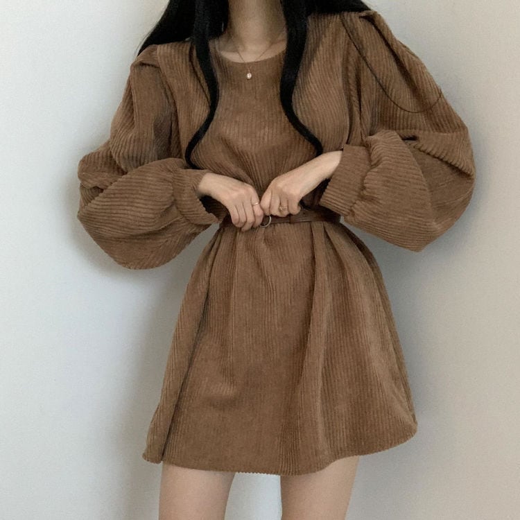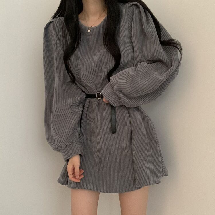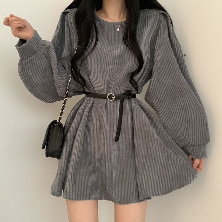 Aラインワンピース ミニワンピース 長袖 無地 冬 Aライン ウエストベルト かわいい 大人可愛い きれいめ シンプル 大人 上品 おしゃれ かっこいい 大人女子 キュート ガーリー セクシー Uネック コーデュロイ 黒 ブラック ブラウン グレー 通勤 通学 デート お出かけ 女子会 モテ 脚長 着痩せ | Rena 韓国ファッション レディースアパレル