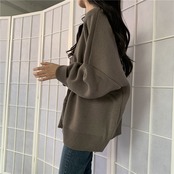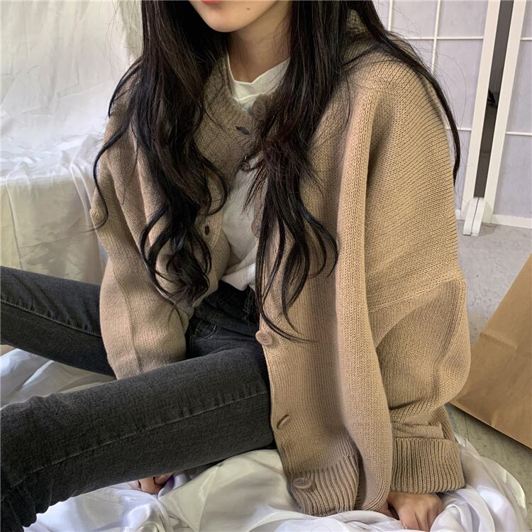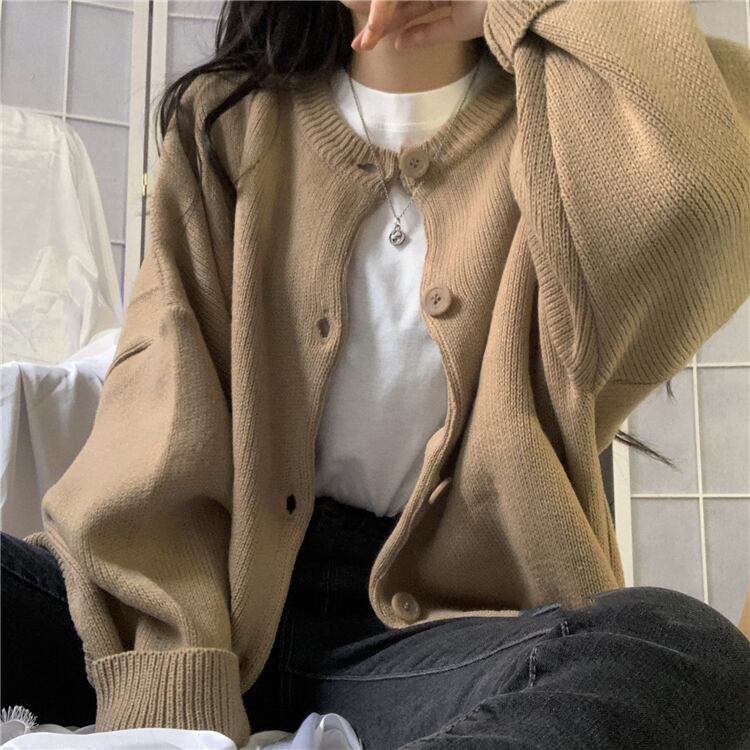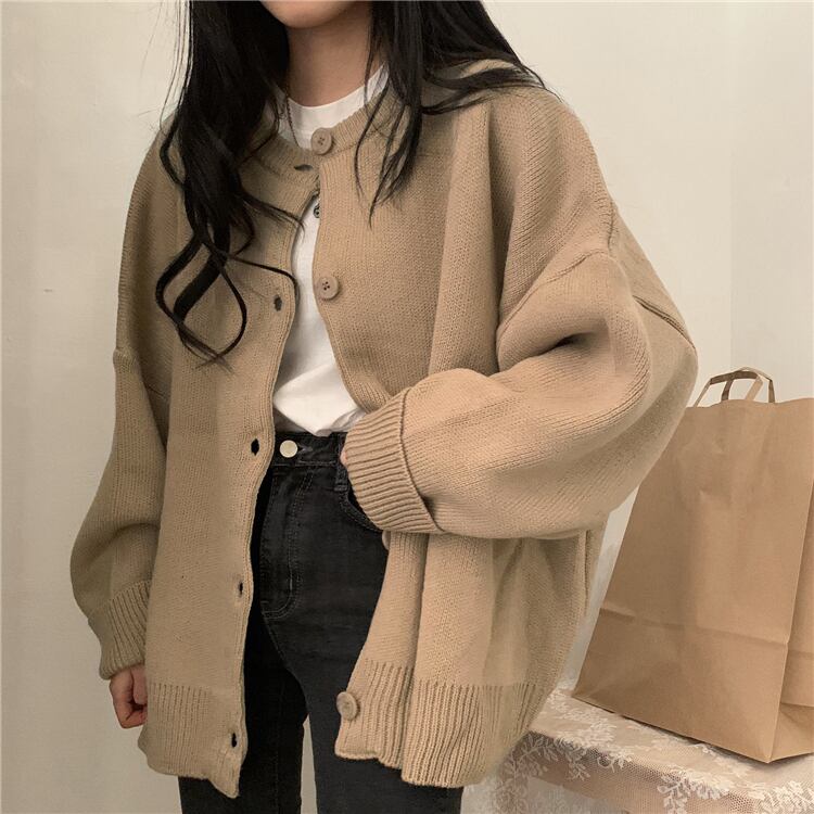 ニット カーディガン 長袖 無地 秋 冬 ワイド かわいい シンプル カジュアル おしゃれ かっこいい 大人可愛い こなれ感 ラフ メンズライク ガーリー ルーズ Uネック ブラウン ベージュ 大きめ ゆったり ゆる 学生 通学 お出かけ 公園デビュー 女子会 アウトドア コーデ 楽ちん 体系カバー 着やせ | Rena 韓国ファッション レディースアパレル