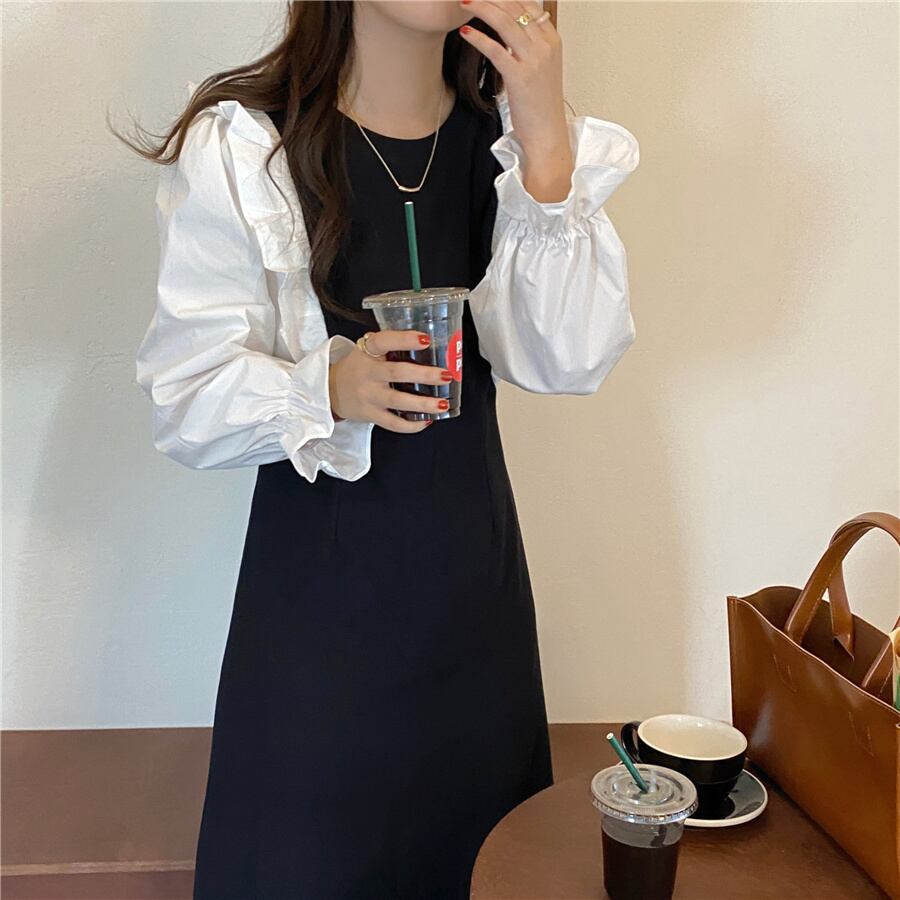 ワンピース シャツワンピース Aラインワンピース 切り替えデザイン ドッキング フリル かわいい 大人可愛い きれいめ おしゃれ かっこいい レトロ ラブリー キュート エレガント Uネック パフスリーブ 白シャツ 白 ホワイト 黒 ブラック 10代 20代 通勤 学生 通学 デート お出かけ 女子会 重ね着 送料無料 | Rena 韓国ファッション レディースアパレル