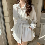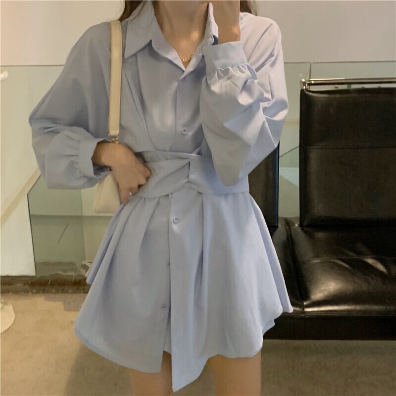 ワンピース シャツワンピース ミニ丈 長袖 リボン ベルト シンプル カジュアル 大人 おしゃれ かっこいい 大人女子 メンズライク 個性的 セクシー Vネック 襟付き 10代 20代 OL 通勤 学生 通学 デート お出かけ 女子会 着回し 重ね着 コーデ スタイル モテ 脚長 送料無料 | Rena 韓国ファッション レディースアパレル