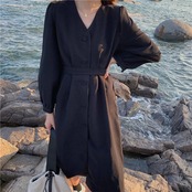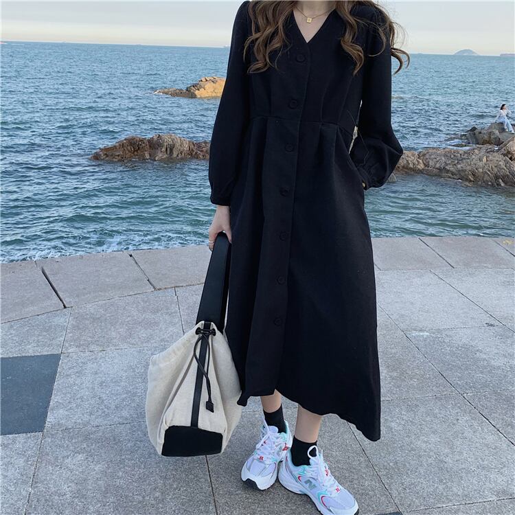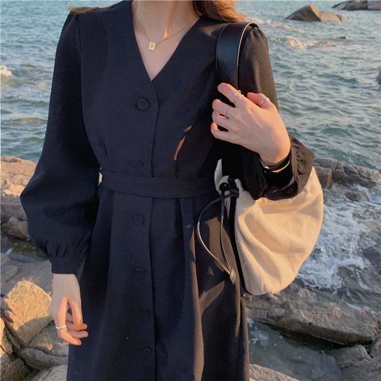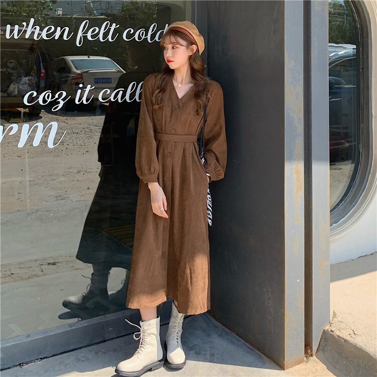 ワンピース トレンチワンピース ミモレ丈 長袖 無地 秋 冬 ハイウエスト 大人可愛い きれいめ シンプル 大人 上品 おしゃれ かっこいい レトロ 大人女子 メンズライク モード系 Vネック コーデュロイ 黒 ブラック 10代 20代 30代 オフィス ビジネス OL 通勤 学生 通学 デート お出かけ 公園デビュー 女子会 イベント ファッション モテ 脚長 送料無料 | Rena 韓国ファッション レディースアパレル