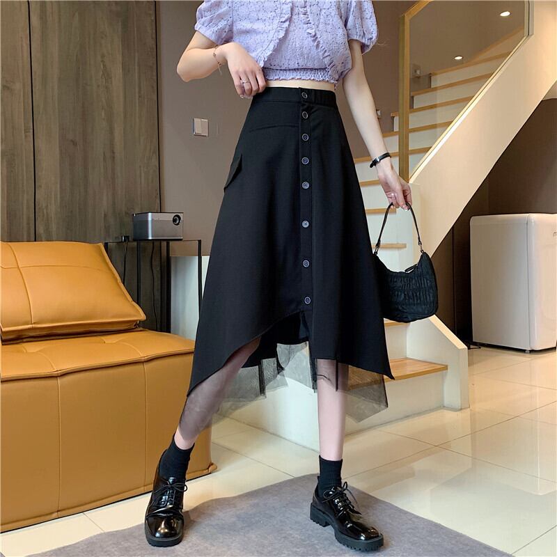 アシメントリーで不規則な裾の長さと、センターに並んだボタンが印象的。
