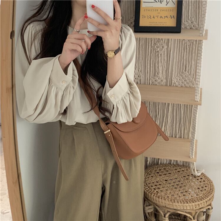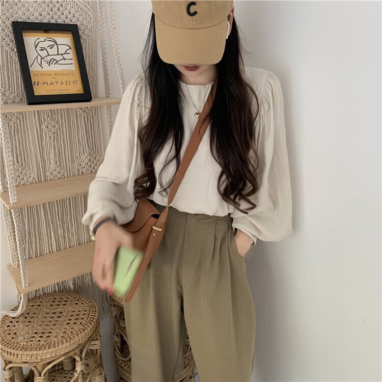 パフスリーブが可愛い、ナチュラルな雰囲気のベージュの長袖トップスと、カーキ色のワイドレッグパンツです。