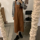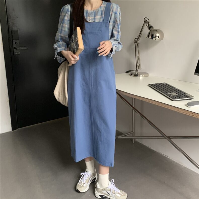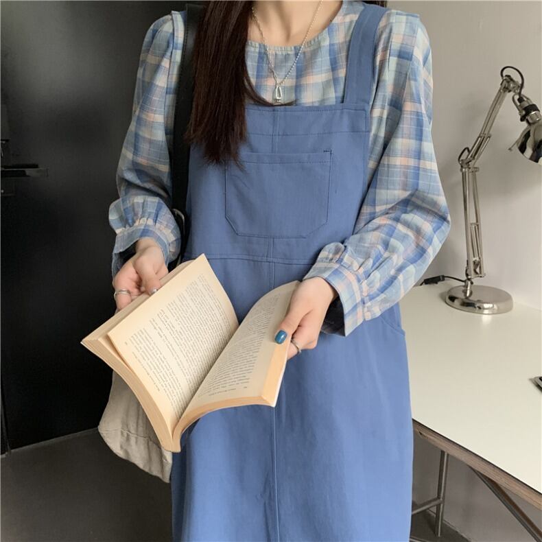 セットアップ シャツ ジャンパースカート ミモレ丈 長袖 チェック 春 秋 冬 ストレート かわいい 大人可愛い シンプル カジュアル 大人 上品 おしゃれ 大人女子 ガーリー 2点セット お得 青 ブルー カーキ フリーサイズ ゆったり 10代 20代 30代 女性用 学生 通学 デート お出かけ 公園デビュー 女子会 休日 着回し 普段使い 重ね着 コーデ 楽ちん 体系カバー プチプラ 送料無料 | Rena 韓国ファッション レディースアパレル