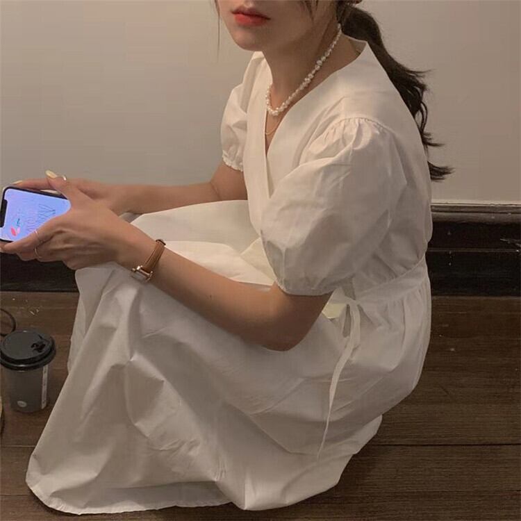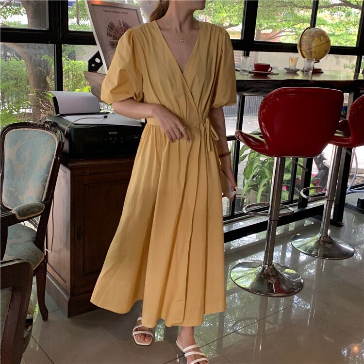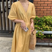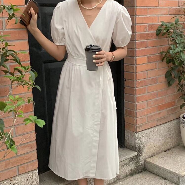 ワンピース カシュクールワンピース ロング丈 五分袖 春 夏 秋 セミフレア ウエストマーク かわいい 大人可愛い きれいめ シンプル カジュアル 大人 上品 おしゃれ 大人女子 こなれ感 エレガント Vネック ロング パフスリーブ 白 ホワイト ブルー パープル 黄色 カラバリ フリーサイズ 20代 30代 40代 50代 OL 通勤 デート お出かけ 女子会 お泊まり 休日 パーティー イベント リゾート 旅行 韓国系 ファッション スタイル 体系カバー 美脚 脚長 プチプラ 送料無料 | Rena 韓国ファッション レディースアパレル