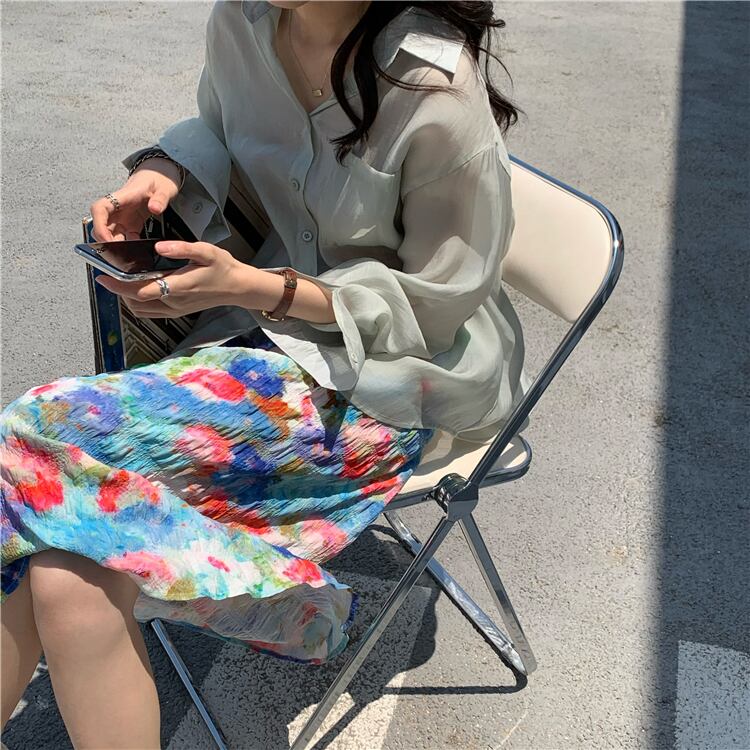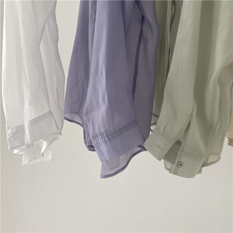シャツ ブラウス 長袖 無地 春 夏 秋 透け感 シースルー きれいめ 大人 上品 おしゃれ 大人女子 こなれ感 ガーリー セクシー Vネック 襟付き 緑 グリーン 紫 パープル OL 通勤 学生 通学 デート お出かけ 女子会 お泊まり リゾート 重ね着 コーデ モテ 送料無料 | Rena 韓国ファッション レディースアパレル
