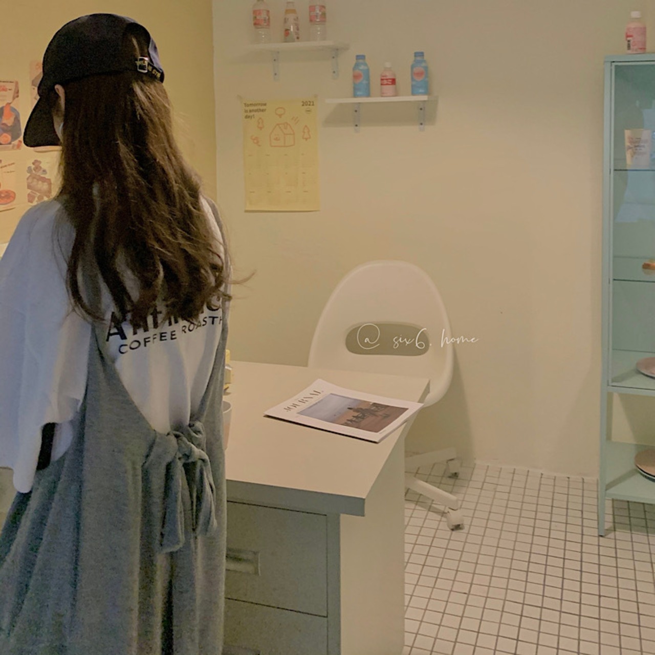ワンピースはエプロンのようにバックにリボンが付いていてキュートに着こなせます。