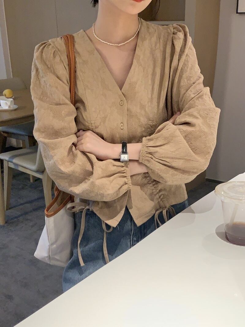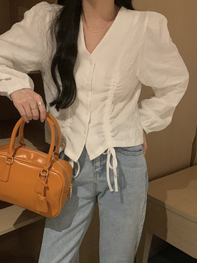 ブラウス カットソー ショート丈 長袖 春 秋 フレア リボン かわいい 大人可愛い シンプル 大人女子 ラブリー ガーリー セクシー Vネック 襟なし 白 ホワイト ベージュ 10代 20代 30代 オフィス ビジネス OL 通勤 学生 通学 デート お出かけ 公園デビュー 女子会 お泊まり リゾート 旅行 フォーマル ファッション コーデ スタイル モテ 送料無料 | Rena 韓国ファッション レディースアパレル