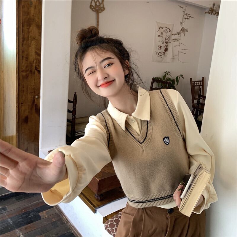 ブラウス ベスト 長袖 無地 ライン 春 秋 冬 かわいい 大人可愛い きれいめ シンプル 大人 上品 おしゃれ 大人女子 こなれ感 ラブリー キュート ガーリー Vネック 2点セット ツーピース 白 ホワイト 茶色 ブラウン 10代 20代 30代 オフィス OL 通勤 学生 通学 デート お出かけ 女子会 お泊まり アウトドア イベント リゾート 重ね着 ファッション コーデ スタイル モテ 送料無料 | Rena 韓国ファッション レディースアパレル