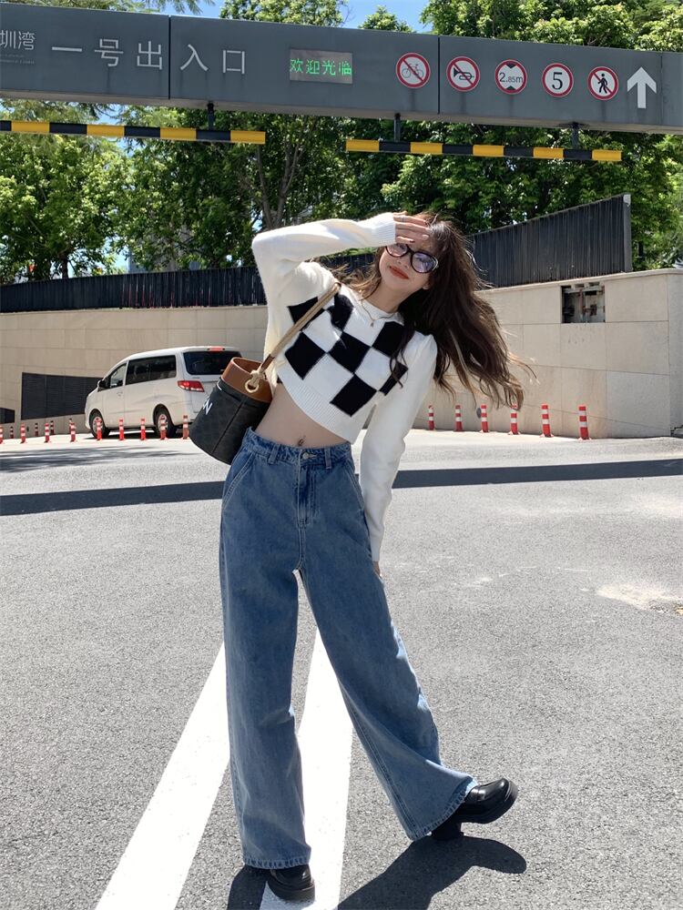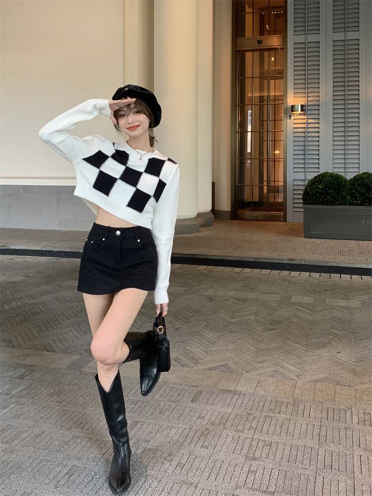 黒と白の大きなチェッカーボード柄のショート丈セーターです。