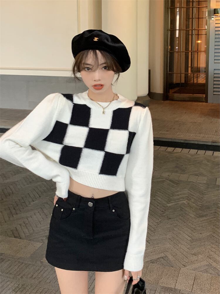 ニット セーター ショート丈 長袖 チェック 春 秋 冬 大人可愛い きれいめ シンプル 大人 上品 おしゃれ お洒落 かっこいい 大人女子 ガーリー 個性的 セクシー クルーネック 白 ホワイト 10代 20代 OL 通勤 学生 通学 デート お出かけ 女子会 お泊まり ファッション コーデ スタイル モテ 送料無料 | Rena 韓国ファッション レディースアパレル