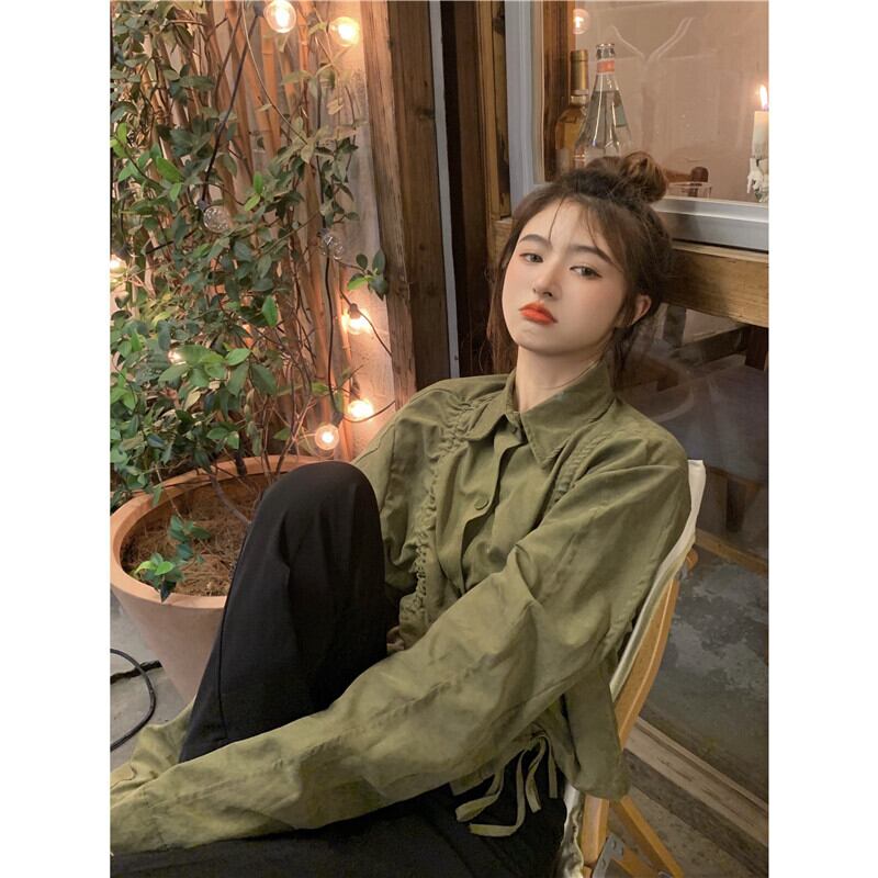 トップス シャツ ジャケット ショート丈 長袖 無地 秋 冬 シャーリング ギャザー 前開き 大人可愛い シンプル カジュアル おしゃれ お洒落 かっこいい エキゾチック 大人女子 こなれ感 メンズライク ルーズ 個性的 クール 袖あり 大人カラー ミリタリー フリーサイズ 10代 20代 30代 40代 OL 学生 お出かけ イベント モテ 脚長 新作 トレンド 流行 インスタ映え 送料無料 | Rena 韓国ファッション レディースアパレル