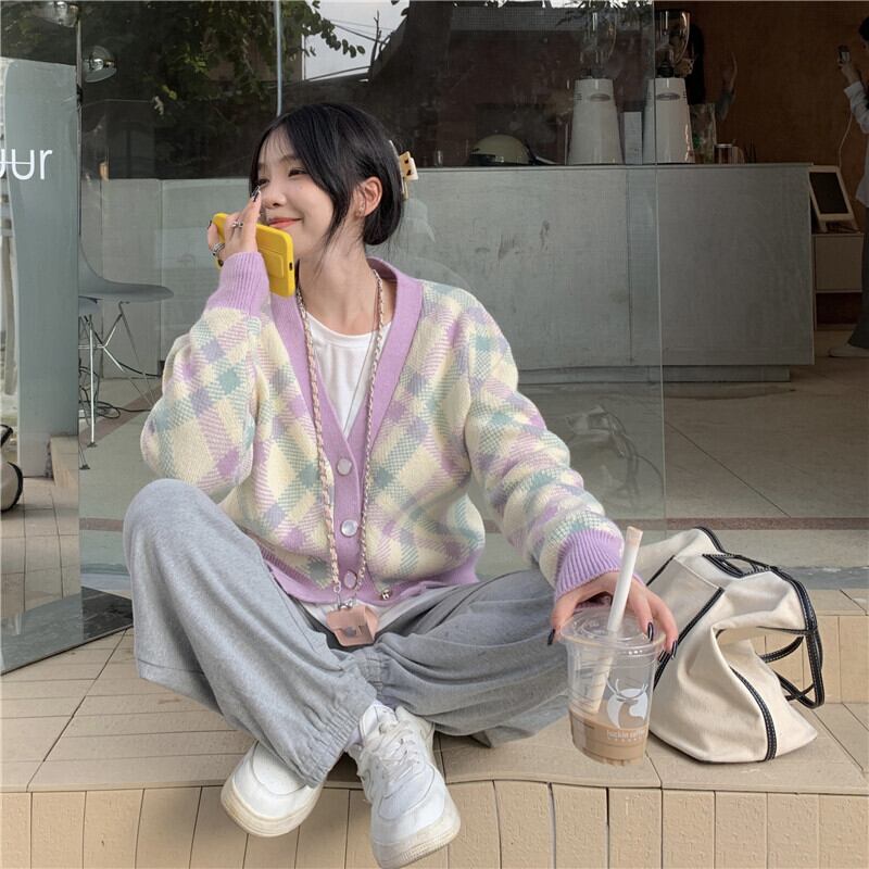 アウター レディース ニット カーディガン ショート丈 長袖 チェック 春 秋 冬 前開き かわいい 大人可愛い お洒落 かっこいい レトロ 大人女子 ラフ ラブリー キュート ガーリー 抜け感 Vネック 襟なし ミニ 袖あり パステルカラー フリーサイズ 10代 20代 30代 女性用 ママ OL 通勤 学生 通学 デート お出かけ 女子会 休日 パーティー イベント 誕生日 クリスマス バレンタイン 着回し 普段使い 重ね着 韓国系 オルチャン ファッション コーデ モテ 脚長 新作 送料無料 | Rena 韓国ファッション レディースアパレル
