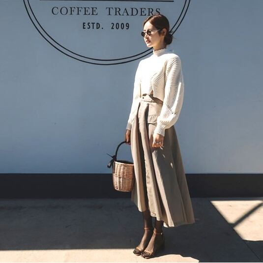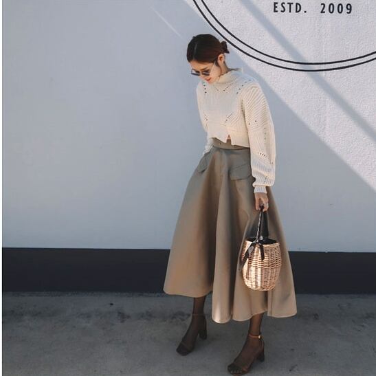 ショート丈とハイネックがかわいいニットとAラインスカートのセットです。