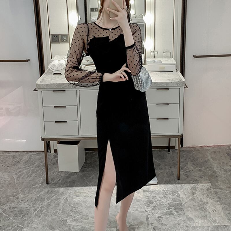 ワンピース タイトワンピース 長袖 ドット 秋 冬 スリム タイト 細身 スリット サイドスリット 切り替えデザイン 透け感 シースルー きれいめ エキゾチック 大人女子 こなれ感 クール セクシー エレガント モダン 主役級 存在感 ワンピドレス 黒 ブラック 大人カラー S M L XL 10代 20代 30代 40代 女性用 お出かけ パーティー イベント 結婚式 二次会 披露宴 韓国系 ファッション コーデ スタイル 美脚 脚長 新作 インスタ映え | Rena 韓国ファッション レディースアパレル