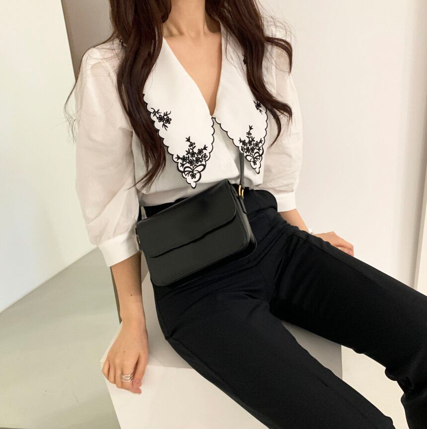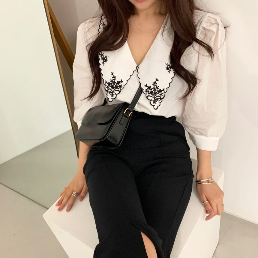 刺繍のついた大きな襟が特徴のブラウスです。