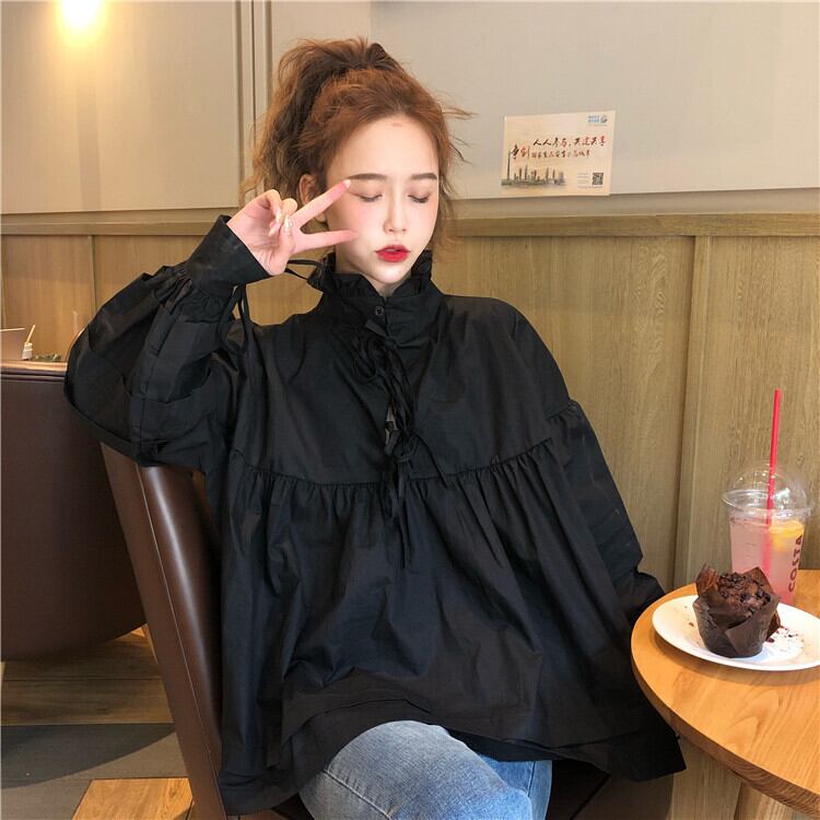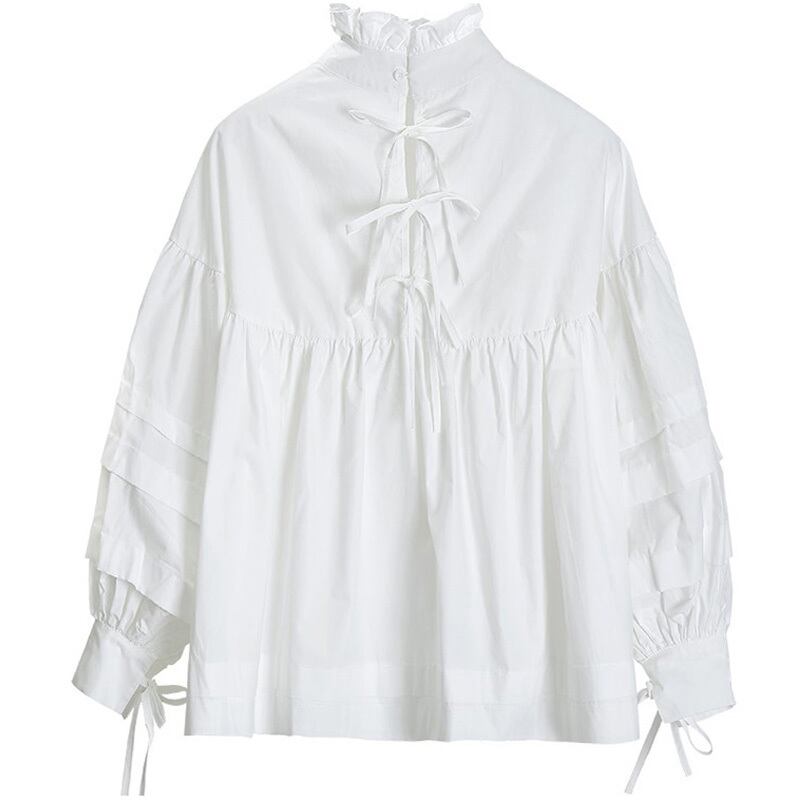 シャツ ブラウス 長袖 無地 リボン 春 秋 フレア フリル かわいい 大人可愛い シンプル 大人 上品 おしゃれ お洒落 レトロ ラブリー キュート ガーリー 個性的 ハイネック 萌袖 白 ホワイト 黒 ブラック OL 通勤 学生 通学 デート お出かけ ファッション コーデ スタイル モテ 送料無料 | Rena 韓国ファッション レディースアパレル