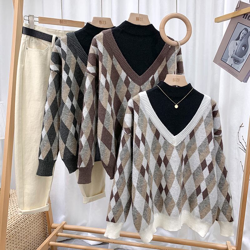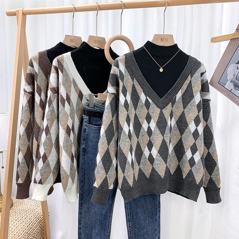 ニット セーター 長袖 刺繍 アーガイルチェック 秋 冬 重ね着風 カジュアル 大人 上品 おしゃれ お洒落 レトロ ハイネック 茶色 ブラウン 灰色 グレー アプリコット 10代 20代 30代 40代 オフィス ビジネス OL 通勤 学生 通学 デート お出かけ 公園デビュー 女子会 着回し 普段使い ファッション コーデ スタイル あったか 暖かい モテ 送料無料 | Rena 韓国ファッション レディースアパレル