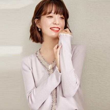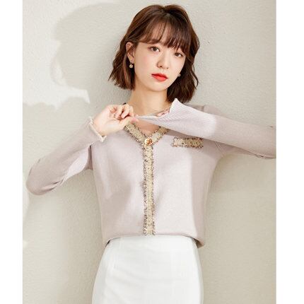 淡いパープルが女性らしい雰囲気のニットカーディガンです。