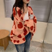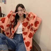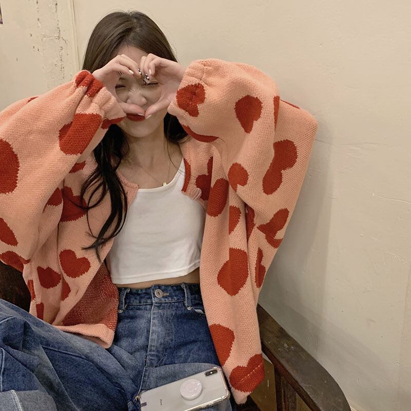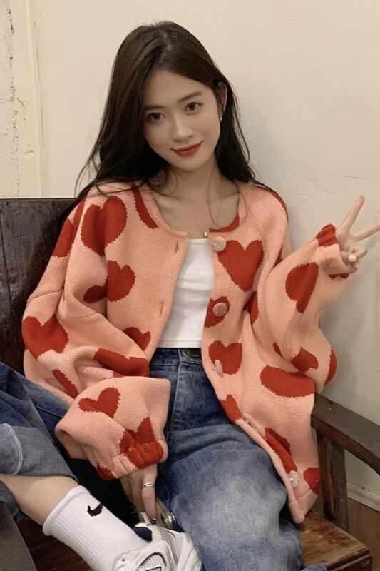 ニット カーディガン ハート ピンク 長袖 柄 秋 冬 ワイド 前開き かわいい 大人可愛い きれいめ シンプル カジュアル 大人 上品 おしゃれ かっこいい レトロ 大人女子 こなれ感 ラフ ラブリー キュート ガーリー エレガント ラウンドネック 襟なし 袖あり ボリューム袖 ニット フリーサイズ 10代 20代 30代 40代 通勤 学生 通学 デート お出かけ 女子会 休日 着回し 普段使い ファッション コーデ スタイル 楽ちん あったか モテ 体系カバー 送料無料 | Rena 韓国ファッション レディースアパレル