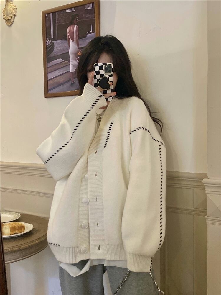 ビッグサイズのニットカーディガンで、袖や裾など所々に入ったステッチがキュートな一枚です。